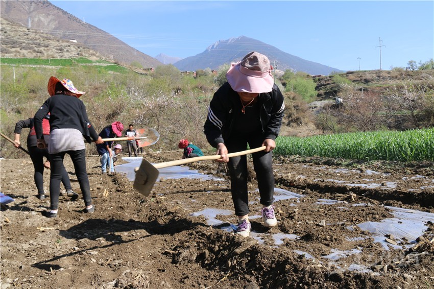 4月15日,記者從巴塘縣城出發(fā),沿國(guó)道318線走訪了該縣的5個(gè)村莊,沿途看到絕大多數(shù)耕地都鋪上了地膜,記者在該縣黨巴鄉(xiāng)玉卡通村看到正在忙碌播種玉米的村民。而這支春耕隊(duì)伍的“帶頭人”正是該村村民大尼瑪,在場(chǎng)的人都是其家人或鄰居。