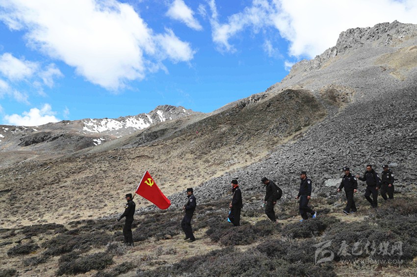 為確保蟲草采挖期間的社會(huì)治安穩(wěn)定,縣公安局抽調(diào)精干力量,前往哈幾山、莫庫(kù)溝等多個(gè)蟲草采挖點(diǎn)開(kāi)展巡山維穩(wěn)。這次和我們一起開(kāi)展常規(guī)巡邏的共有8名公安干警。降初是本地人,1.78米的個(gè)子,一路上,他高舉黨旗、步履矯健、勇往直前,成為我們大家的“領(lǐng)路人”,大家經(jīng)常和他開(kāi)玩笑說(shuō):“跟著黨(旗)走永遠(yuǎn)不迷路”。