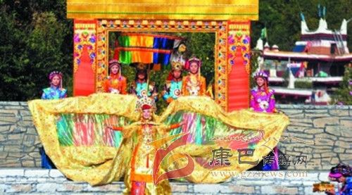 在催人奮進(jìn)的戰(zhàn)鼓聲中,一群身披甲胄的士兵拿著長劍,背著巨弓走到臺前,在鏗鏘的戰(zhàn)鼓聲中,戰(zhàn)士們做著各種競技動作,模仿武士們互相攻擊的樣子,那矯健的身影展示了遠(yuǎn)古時(shí)代嘉絨藏族先民們?yōu)榱松媾c自然努力抗?fàn)幍膱鼍?。過了一會兒音樂一轉(zhuǎn),戰(zhàn)鼓聲漸漸減弱,在鳥雀的陣陣啾啾聲中,一座木門慢慢的開啟,一位身披長袍、頭戴鳳冠的女王在眾多美女的簇?fù)硐?,緩緩走下臺階步入舞臺中央,此時(shí),一位手捧托盤的老者來到女王面前單膝下跪,將托盤高舉過頂,并邀請女王品嘗佳肴,女王將中指在酒中蘸了蘸,并曲起中指向四周輕輕彈去,寓意愿將杯中美酒與四方百姓同飲。在女王面前還放置著一個(gè)凈水桶,桶中盛滿了清澈的甘泉,桶上橫放著一枝柏樹枝,女王伸出纖纖玉手,拿著柏樹枝在水中蘸了蘸,面向墨爾多神山撒去,寓意向神山祈福。這是此次《美人谷·丹巴》節(jié)目展演中的序曲部分,有著強(qiáng)烈的東女神韻,將遠(yuǎn)古時(shí)代東女國女王遺風(fēng)展演的淋漓盡致。