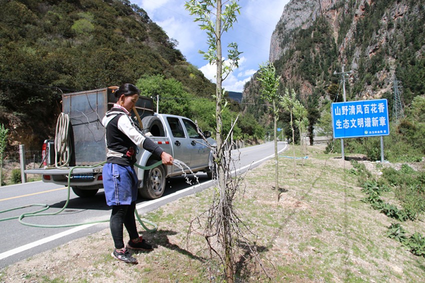植樹容易,保持存活率很難。“植樹植樹,一分栽九分管。我們植樹造林不只看數(shù)量,更注重質(zhì)量,注重栽植方法和科學的后期養(yǎng)護管理,保證樹木的成活率。”6月11日,在白玉縣絨蓋鄉(xiāng),長江造林局駐白玉管護站站長梁榮忙著進行現(xiàn)場管護技術(shù)指導,“把遮陽網(wǎng)裹緊點、把刺巴綁緊點,以免牛和馬啃皮子;水要澆透,不然水分不夠,樹子一斷水,再想‘返陽’就難了;護欄水泥樁要栽牢,不然牛馬一撞就倒了……”。