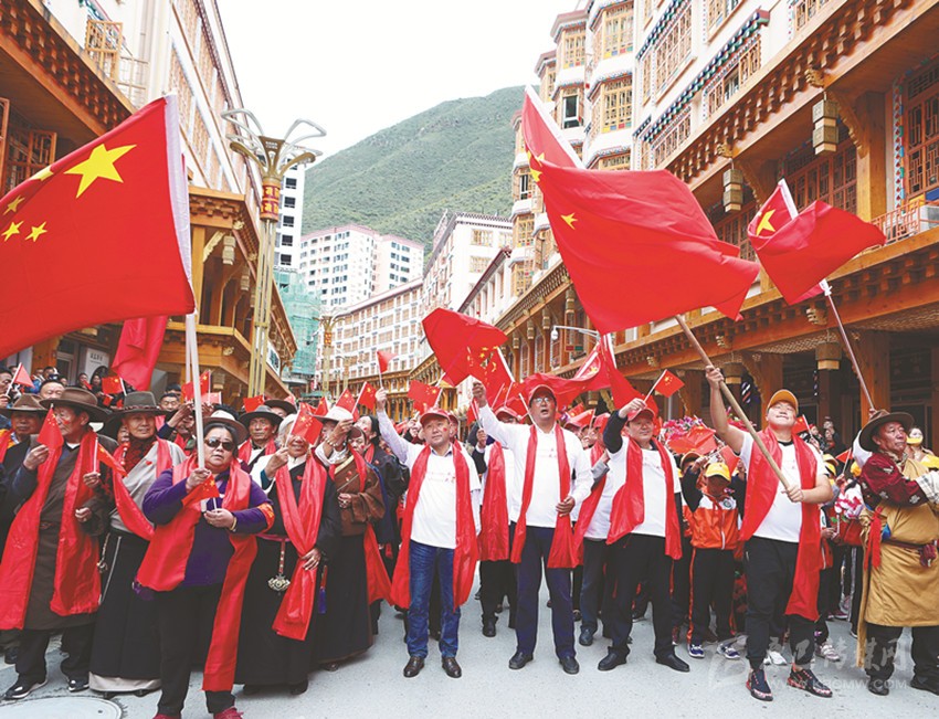 伴隨著悠揚(yáng)的旋律,在當(dāng)?shù)馗袼_爾藝術(shù)團(tuán)演員的帶領(lǐng)和感染下,幾千名當(dāng)?shù)馗刹咳罕娚碇A服,揮舞著手中的五星紅旗,懷著無比激動(dòng)的心情獻(xiàn)歌祖國(guó),同唱《我和我的祖國(guó)》。深情激昂的歌聲感染到在場(chǎng)的每一個(gè)人,有的高呼喝彩、有的熱淚盈眶,齊聚在鮮紅的國(guó)旗下,齊聲高喊:“我愛祖國(guó),祖國(guó)萬歲!”