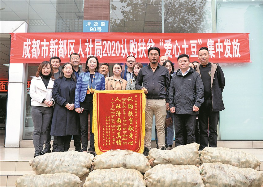 “感謝你們幫助認購3萬余斤土豆……扎西德勒!”11月6日上午8點36分,“愛心土豆”車隊剛在新都區(qū)人社局停車場停穩(wěn),降央吉村一個躍步下車,為等候多時的人社局送上“認購扶貧獻愛心、人社濟困寫真情”的錦旗。