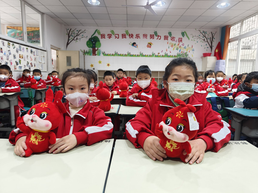 記者注意到,整個(gè)校園及各班教室都布置了精美的迎新文化墻,上面張貼懸掛著學(xué)生們?cè)诤偕钪兄谱鞯闹黝}創(chuàng)意海報(bào)。教室內(nèi),每張課桌上不僅插著寫(xiě)滿祝福語(yǔ)的彩色氣球,還擺放著用紅絲帶打包好的新課本或一套精美文具或一只兔子玩偶,亦或是棒棒糖、旺仔牛奶等零食,均寓意新學(xué)期大吉大利、越來(lái)越棒、大展鴻“兔”、“兔”飛猛進(jìn)?!斑@些別出心裁的小禮物,能給孩子們留下一個(gè)美好的記憶點(diǎn),在給學(xué)生們帶來(lái)驚喜的同時(shí),也送上一份最美、最真摯的新學(xué)期祝福!”教師黃宇虹說(shuō)。