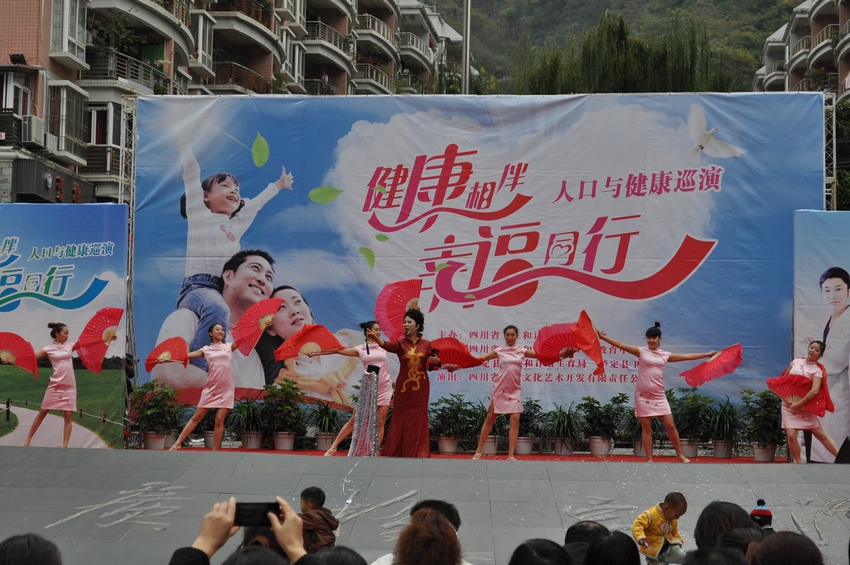 舞臺(tái)上“健康相伴•幸福同行”大型演出背景格外醒目,由省虹宇藝術(shù)團(tuán)自編自演的舞蹈《歌舞青春》、金錢(qián)板《怪哪個(gè)》、小品《你生不生》、四川清音《分級(jí)診療就是好》、雜技《烏依人》、戲曲《天府奇葩》等節(jié)目陸續(xù)登場(chǎng)。演員們通過(guò)戲曲、歌曲等形式,向廣大觀(guān)眾傳播衛(wèi)生計(jì)生新政策,臺(tái)下各縣屬醫(yī)療衛(wèi)生計(jì)生機(jī)構(gòu)醫(yī)務(wù)人員免費(fèi)開(kāi)展義診活動(dòng),為廣大群眾查血壓、詢(xún)問(wèn)病史、咨詢(xún)等忙個(gè)不停,群眾與演員互動(dòng)場(chǎng)面感人。演出活動(dòng)取得良好的教育效果,得到廣大群眾的熱烈歡迎。