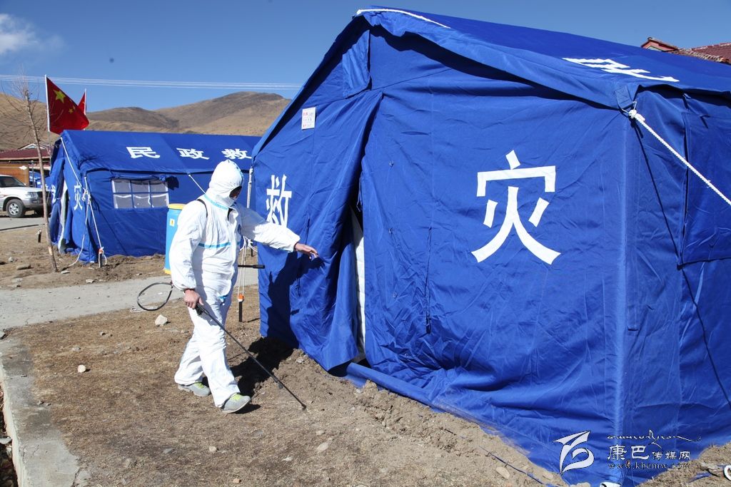 在離武警武警四川總隊(duì)二支隊(duì)的醫(yī)務(wù)站不遠(yuǎn)的地方,新都橋中心衛(wèi)生院的衛(wèi)生員羅衛(wèi)強(qiáng)正“全副武裝”的為每一頂帳篷做著消毒。羅衛(wèi)強(qiáng)說:“我們從地震第一天到現(xiàn)在一直堅(jiān)守在一線,22日到26日都在祖慶小學(xué)進(jìn)行消毒工作,27日和其他工作人員換班到了江巴牧民新村安置點(diǎn)。我們每天會早上一次,晚上一次對每一間帳篷進(jìn)行兩次消毒。除了我們,康定縣疾控中心的工作人員還會每天進(jìn)行一次消毒,我們都在盡最大的努力保證牧民生活環(huán)境的衛(wèi)生。”在對環(huán)境進(jìn)行消毒后,他又來到醫(yī)療就助點(diǎn)為前來就醫(yī)的甲瑪它看起病來。