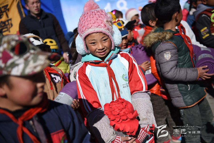 新華網(wǎng)“你好,318”全媒體行活動(dòng)領(lǐng)隊(duì)黨文伯為孩子送防寒毛毯(薛玉斌 攝)