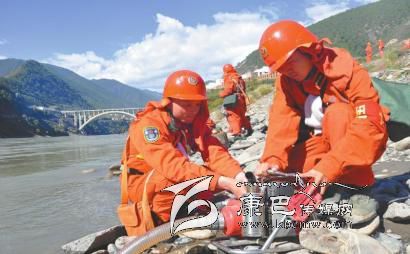 圖為徐驊(右)和戰(zhàn)士在架設(shè)水泵準(zhǔn)備滅火。 (武警四川省森林總隊(duì)甘孜州支隊(duì)供圖)