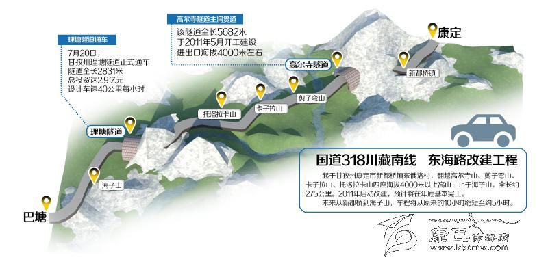 國道318川藏南線是四川進(jìn)藏大通道之一,也是甘孜藏族自治州境內(nèi)極其重要的交通主干道之一。2011年啟動建設(shè)的東海路改建工程,按三級公路標(biāo)準(zhǔn)改建,起于甘孜州康定市新都橋鎮(zhèn)東俄洛村,翻越高爾寺山、剪子彎山、卡子拉山、托洛拉卡山四座海拔4000米以上高山,止于海子山,全長約275公里。