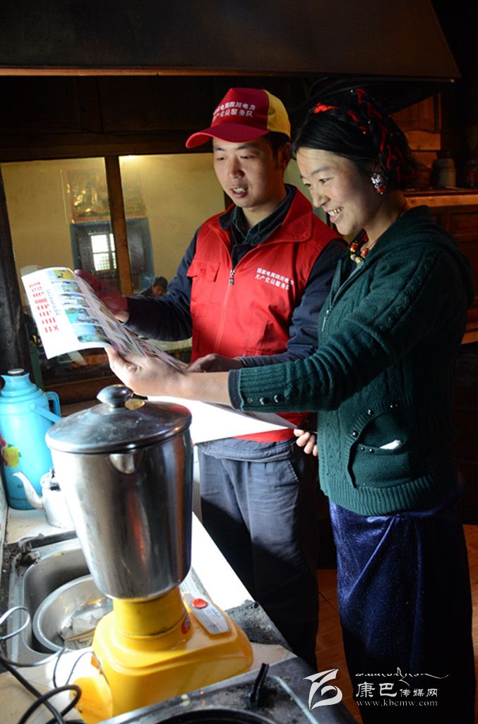 告別學(xué)校的同學(xué)們,新都橋供電所的工作人員又趕向下一個地點(diǎn)——瓦澤鄉(xiāng)營官村。走進(jìn)一戶農(nóng)民的家里,女主人汪修卓瑪正在用打茶機(jī)制作酥油茶,打茶機(jī)旁的電爐上一個水壺正在咕嚕咕嚕地冒著熱氣。工作人員趕緊走上去關(guān)掉電爐,并告訴汪修卓瑪:“你們平時使用電爐等家用電器要注意安全,水特別容易導(dǎo)電,水開了要及時關(guān)掉電爐,使用打茶機(jī)時要先擦干外殼和底部的水……”