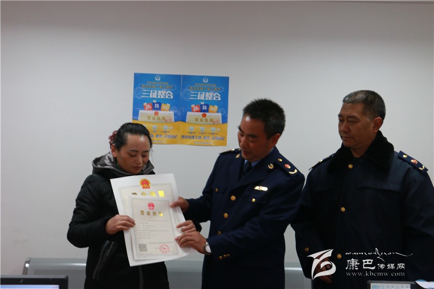 本網(wǎng)訊(迎春 文/圖)12月1日上午,我州首張個體工商戶“三證整合”營業(yè)執(zhí)照在康定市食藥工商局工商所辦證窗口,由州工商局副局長席小康和康定市食藥工質(zhì)局局長楊永勝一同,把新版?zhèn)€體工商戶“三證整合”營業(yè)執(zhí)照發(fā)放到個體工商戶張春碧手中。首發(fā)個體工商戶“三證整合”營業(yè)執(zhí)照拉開了我州個體工商戶“三證整合”登記的帷幕。今后,公民只需填寫“一張表”,向“一個窗口”提交“一套材料”即可辦理個體工商戶、稅務登記及社會保險登記。截止12月1日12點,我州共計發(fā)放個體工商戶“三證合整”新版營業(yè)執(zhí)照15份。