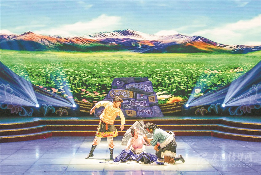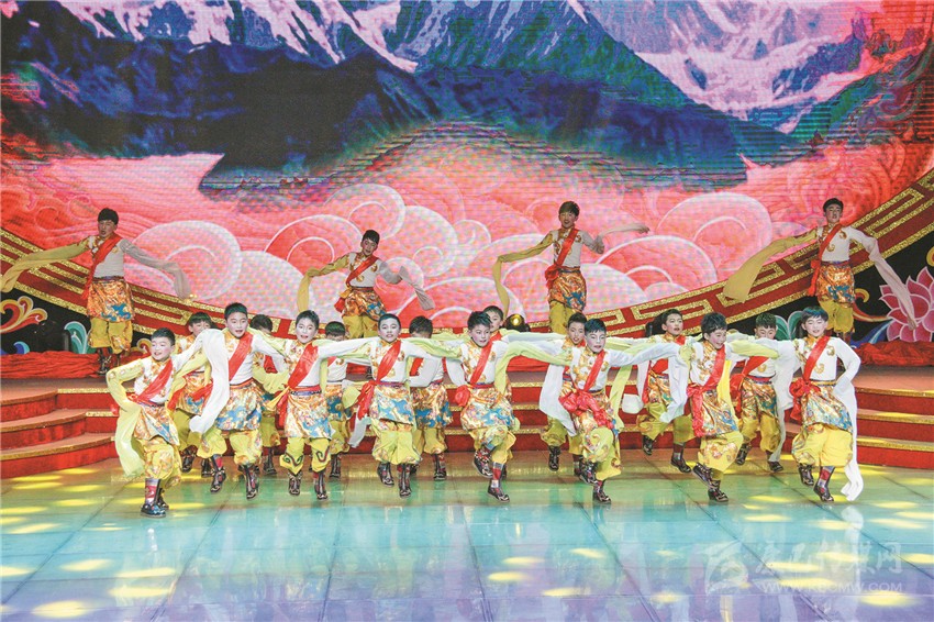 在團(tuán)拜會(huì)節(jié)目演出環(huán)節(jié),隨著主持人一句“柳綠枝頭待燕歸,金雞賀歲開門紅”脫口而出,20余名活潑、歡快的少年涌上舞臺(tái),就著音樂的節(jié)拍,揮手踏足、左挪右轉(zhuǎn),翩翩起舞;少年們舞動(dòng)的長(zhǎng)袖映著縷縷斑斕的光束,依如雄鷹在拍打著飛翔的翅膀。這便是此次演出的開場(chǎng)節(jié)目《雛鷹飛翔》,一場(chǎng)絢麗多彩的“甘孜春晚”由此火熱開演。隨后,一群體態(tài)輕盈、妝如仙鶴的女子用靈動(dòng)的舞姿為甘孜祈福,點(diǎn)明了此次團(tuán)拜會(huì)的一大主旨——祝福甘孜。