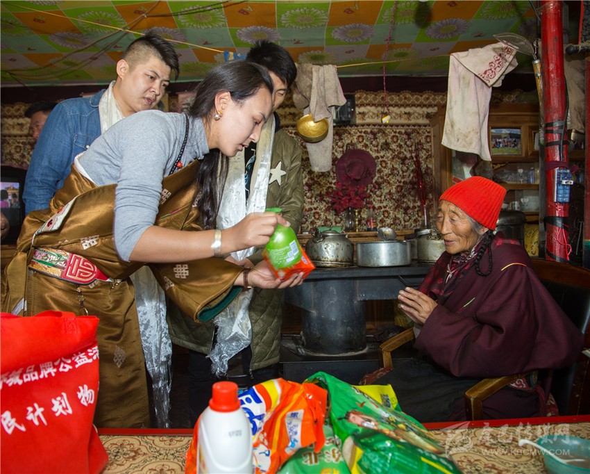 為了及時將物資送到群眾手中,公益小組一行當(dāng)日凌晨4點(diǎn)便從成都出發(fā),于下午1點(diǎn)到達(dá)走訪地石渠縣。隨后,公益小組不顧舟車勞頓,堅(jiān)持走訪了10戶此次“新牧民養(yǎng)成計(jì)劃”示范家庭,為他們送上了生活禮包及文明禮包,并送上了節(jié)日的祝福。年過七旬的卓嘎是本次“新牧民養(yǎng)成計(jì)劃”示范戶之一,體弱多病的她堅(jiān)持要迎接公益小組的到來,并獻(xiàn)上哈達(dá)。收到物資后她激動地說,兩年前華僑城來到石渠縣,為他們帶來了新棉被,那個冬天他們一點(diǎn)都不冷,現(xiàn)在又送來了糧食和生活用品,讓他們可以過上更好的生活。