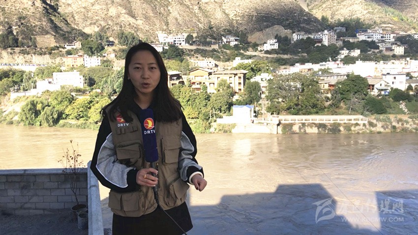 得榮電視臺記者在報道身后金沙江的水情變化。