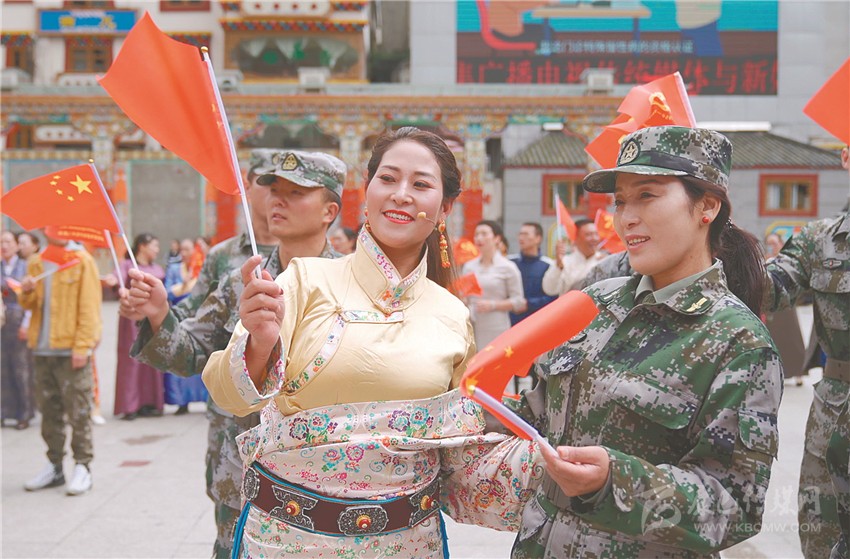 美妙的歌聲縈繞四方,鮮艷的旗幟迎風(fēng)飄揚(yáng)。就在眾人忘情高歌之時(shí),來(lái)自州歌舞團(tuán)的50多名演員將一面巨大的印有“建州70年Logo”的紅旗,在廣場(chǎng)正中鋪展開來(lái)。以這面旗幟為中心,先后到來(lái)的人們組成了三個(gè)同心圓,用歌聲禮贊甘孜州建州70周年。