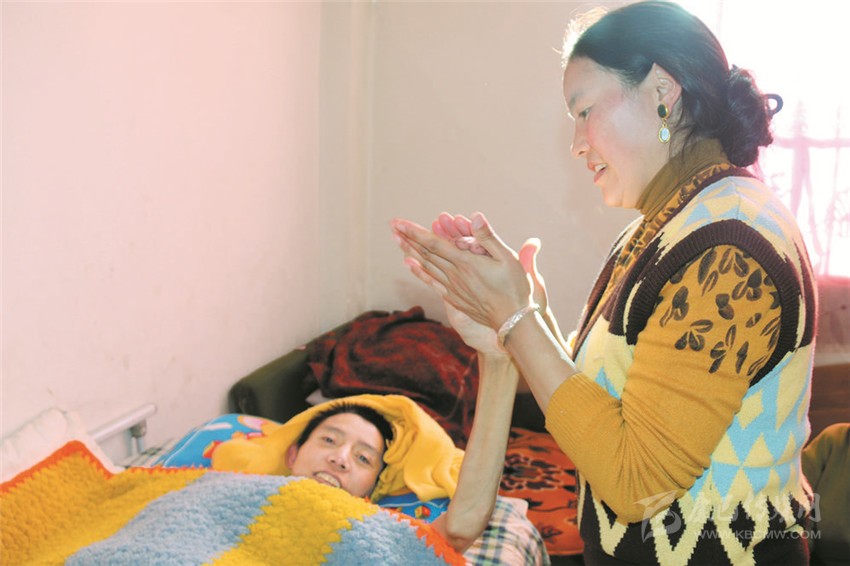 記者看到,根絨一家住的房子雖然簡陋,但卻充滿了愛意。每個房間收拾得整整齊齊,久病臥床的根絨雙目有神,衣著干凈,房間里聞不到任何異味。根絨笑著說:“都是我妻子的功勞,她愛干凈,每天都給我收拾得干干凈凈的。”