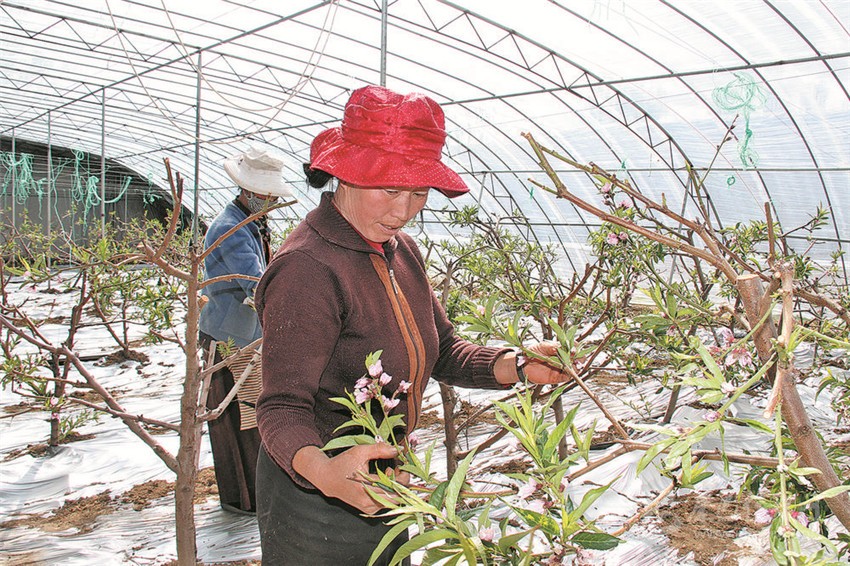 圖為當(dāng)?shù)貏?wù)工農(nóng)牧民正在給高原大棚桃樹疏枝。