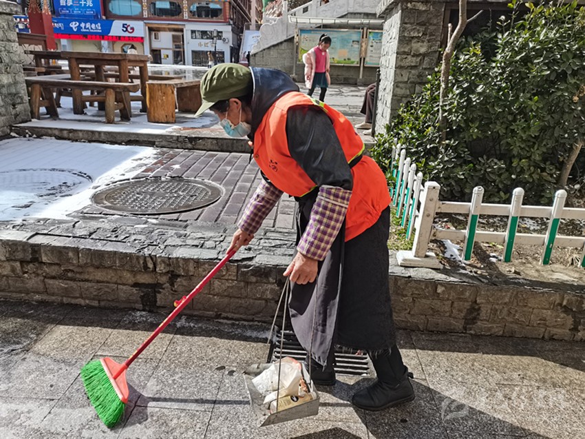 1月30日,農(nóng)歷大年廿九,在康定市的街道,環(huán)衛(wèi)工人宋光芳已穿好工作服,拿著掃帚和撮箕,仔細(xì)地清掃路面。自2012年,宋光芳從事環(huán)衛(wèi)工作,到現(xiàn)在已經(jīng)10個年頭了,在這10年里,她每天早出晚歸,耕耘在環(huán)衛(wèi)工作第一線。為了給市民營造干凈、舒適的節(jié)日環(huán)境,今年春節(jié)她仍和往年一樣堅(jiān)守在工作崗位上,保證城市干凈衛(wèi)生的環(huán)境。