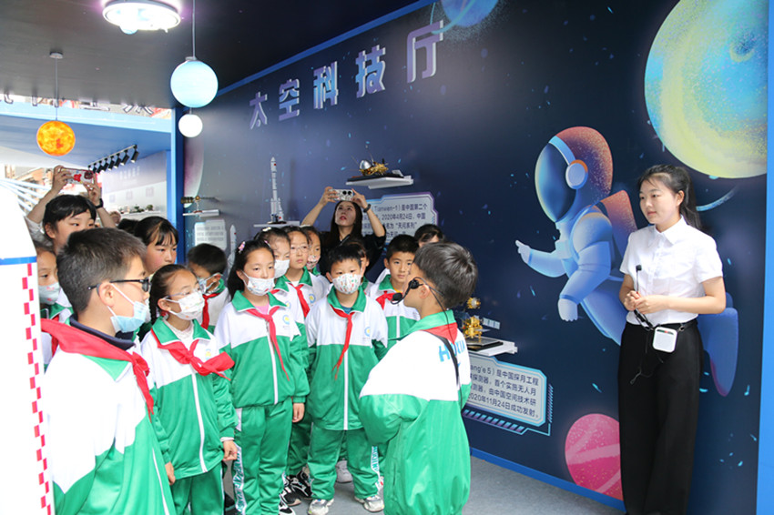 “航天夢是中國夢、華夏夢,神舟十六號載人飛船發(fā)射成功并進入預定軌道。古人仰望星空,幻想上天攬月的夢想,在一代代中國航天人的努力下逐漸變?yōu)榱爽F(xiàn)實?!薄凹t領(lǐng)巾”講解員劉嘉沐在解說他負責的天空科技廳時,將這一喜訊分享給了在場的同學們?!跋M芙枭裰凼栞d人飛船發(fā)射成功的機會,在科普周活動中普及航天知識,讓更多的學生深入了解航天文化,引導青少年傳承航天精神、點燃航天夢想?!敝菘茀f(xié)負責人告訴記者。