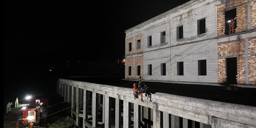 現(xiàn)場還模擬了孤島救援科目。因地震導致震中區(qū)域地質(zhì)松懈,呈塌陷現(xiàn)狀,水位下降,被困人員所在區(qū)域水位下降且通行道路損毀形成孤島。救援隊伍通過偵查,決定采取利用救生拋投器將繩索打至對岸形成橫渡條件,再利用T型繩索救助技術將人員和器材輸送至湖心島,通過破拆、頂撐技術將孤島被困的壓埋人員救出,隨后對被困人員包扎、固定后利用繩索將被困人員轉(zhuǎn)移至安全區(qū)域。