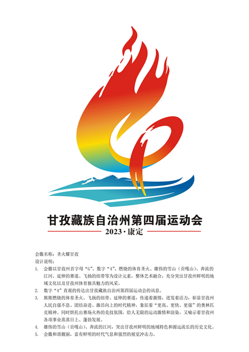 據(jù)王拓進(jìn)介紹,會徽設(shè)計(jì)靈感來自網(wǎng)上看到的貢嘎雪山,所以作品以甘孜州首字母“G”、數(shù)字“4”、燃燒的體育圣火、雄偉的雪山(貢嘎山)、奔流的江河、延伸的賽道、飛揚(yáng)的紐帶等為設(shè)計(jì)元素。數(shù)字“4”直觀地傳達(dá)出甘孜州第四屆運(yùn)動會的訊息;雄偉的雪山(貢嘎山)、奔流的江河,突出甘孜州鮮明的地域特色和源遠(yuǎn)流長的歷史文化;熊熊燃燒的體育圣火、飛揚(yáng)的紐帶、延伸的賽道,傳遞著激情、迸發(fā)著活力,彰顯甘孜州人民自強(qiáng)不息、團(tuán)結(jié)奮進(jìn)、激昂向上的時(shí)代精神,象征著“更高、更快、更強(qiáng)”的奧林匹克精神,同時(shí)烘托出賽場火熱的競技氛圍,給人無限的運(yùn)動激情和渲染,又喻示著甘孜州各項(xiàng)事業(yè)蒸蒸日上、蓬勃發(fā)展。