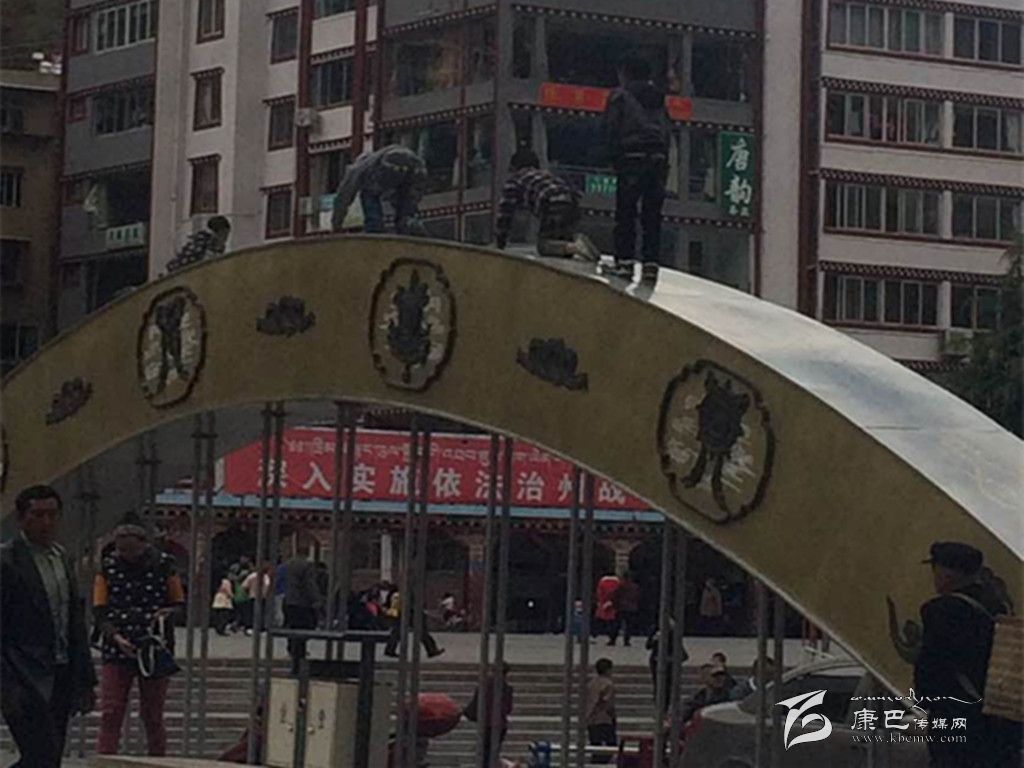 在康定劇場前面的廣場上,每天傍晚,廣場舞大叔大媽都準時前來報到。孩子們則在人群中玩耍。7歲的陽陽(化名)被奶奶帶著來到廣場上學(xué)習(xí)滑旱冰,滑著滑著小伙伴出現(xiàn)了。脫掉冰鞋,陽陽和大家一起開始在“康定情歌”歌譜造型的漢白玉雕塑上攀爬。奶奶則在廣場另一端和老友擺龍門陣,根本無暇顧及。“征服”了“康定情歌”以后,陽陽和伙伴們繼續(xù)“征服”康定劇場臺階前的大塊漢白玉雕塑。“趕快下去,這些娃娃真沒得家教!”一位愛管閑事的中年人制止了孩子們的“不文明”行為。他離開后,陽陽再次奔向漢白玉雕塑……