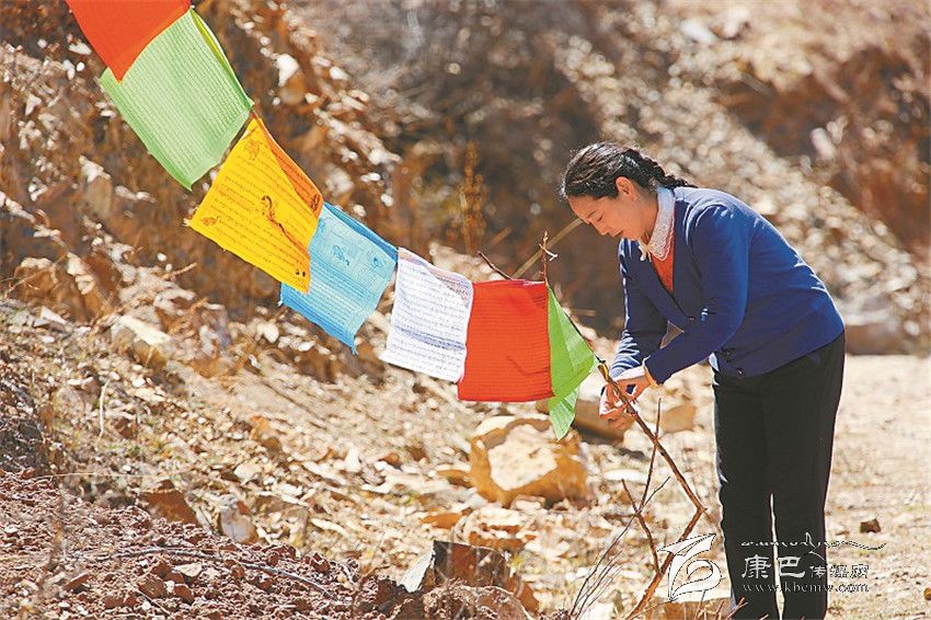 到達(dá)益西村布乃格時,杜勒突然發(fā)現(xiàn)前面有十多米路段已經(jīng)被洪流沖垮了一半。“停車!停車!不能再往前開了!”坐在副駕駛座上的杜勒急忙叫住丈夫,從身上斜挎的小包里拿出五六面風(fēng)馬旗,拉開車門,幾步?jīng)_到了垮塌路段跟前。“不要再過去了,水里有石頭,一會兒被大水沖走了你就完了!”仁孜跟著跳下車,追著她喊??墒嵌爬詹活櫿煞虻暮艉?,蹲在垮塌路面的邊緣,伸出雙手將穿滿風(fēng)馬旗繩子的一端系在路邊山壁的樹枝上。她身子傾斜,右腳伸直踩在被河水沖成斜坡的路基上,左腳彎曲踏著僅剩的一點路面,想將繩子綁得更加牢固。而風(fēng)馬旗卻不聽使喚的在風(fēng)雨交加中搖擺不定,杜勒心中此刻只有一個信念:風(fēng)馬旗上系著的是萬千生命,無論如何也要綁牢實。“你是不是瘋了?路基都空了,要是垮下去你被大水沖走了怎么辦?”仁孜話音剛落,杜勒右腳踩著的那塊泥土突然整塊塌了下去。仁孜一把抓住她的手臂,把她拽了上來。“如果當(dāng)時是她一個人,那肯定沒命了!”仁孜把她拖回車上才發(fā)現(xiàn),杜勒卷起褲管兒的腿上布滿了青青紫紫的淤痕,雙腳顫顫巍巍,幾乎站不穩(wěn)。回到縣城后,醫(yī)生告訴杜勒短時間內(nèi)不能走路,要多休息??墒牵?dāng)天下午,杜勒趁仁孜上班,自己找了一根竹棍子拄著,又趕到下一個坍塌路段做著重復(fù)的工作。
