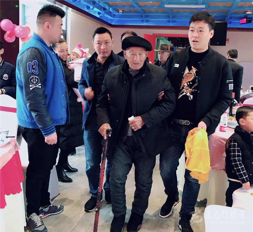 3月5日,在瀘定縣烹壩鄉(xiāng)十里香酒店,按照當?shù)貍鹘y(tǒng),王瑞生的兒孫們提前為他隆重過百歲大壽。雖然已近百歲高齡,但王瑞生精神矍鑠,思路清晰,談吐自如,面色紅潤的他身著簡樸,胸前始終戴著2016年由中共中央、中央軍委頒發(fā)的“中國工農(nóng)紅軍長征勝利80周年紀念章”,接受親友們的祝福?!白D】甸L壽,開開心心”。親人們不絕于耳的祝福,老人心滿意足,笑容滿面?!昂?,好,我的家人團圓和睦,家庭幸福,是我最大的心愿?!比缃瘢先艘咽撬氖劳?,家人濟濟一堂,親情流淌,老人幸福開懷。