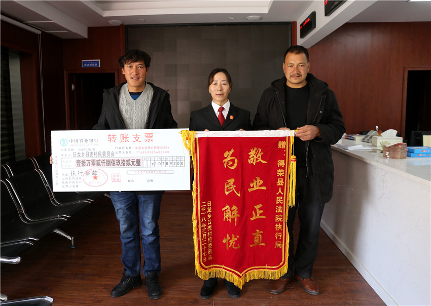 在執(zhí)行款發(fā)放現(xiàn)場,得榮法院執(zhí)行局局長小娜錯法官正逐一核對當事人信息,辦理領款手續(xù),她向筆者介紹說:“去年開始,我們在共擬定出了29個基本解決執(zhí)行難的工作任務,形成了7條具體措施,對所屬的11件執(zhí)行難案每件形成專項行動方案,并將‘一案一辦法’的基本原則落實到了后續(xù)的23件案件執(zhí)行當中,取得了良好的執(zhí)行效果,今后我們將持續(xù)深入執(zhí)行難專項行動,全面深入落實依法治理,切實保護人民群眾的合法權益,努力讓人民群眾在每一件司法案件中都感受到公平正義,感受到更多的幸福感和安全感。”