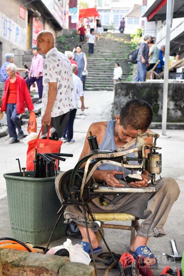 南部縣長坪鎮(zhèn)文化街,前來修鞋的鄉(xiāng)鄰正在與周強(qiáng)善交流。攝影 張可凡