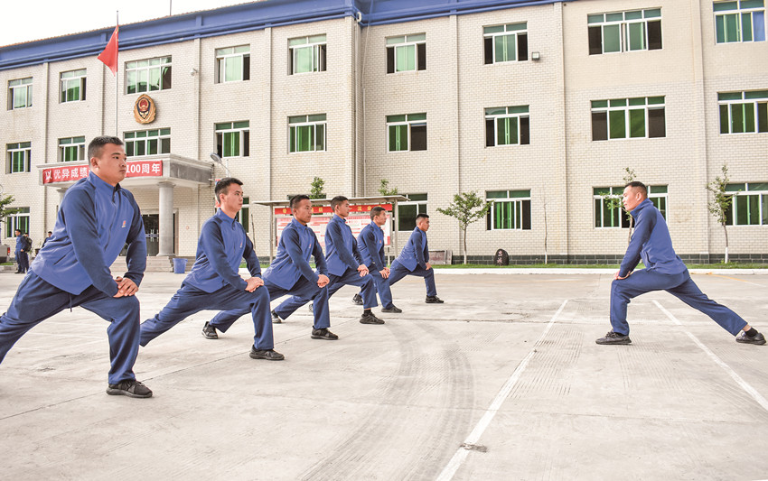 張大雄在帶領中隊人員開展體能訓練。