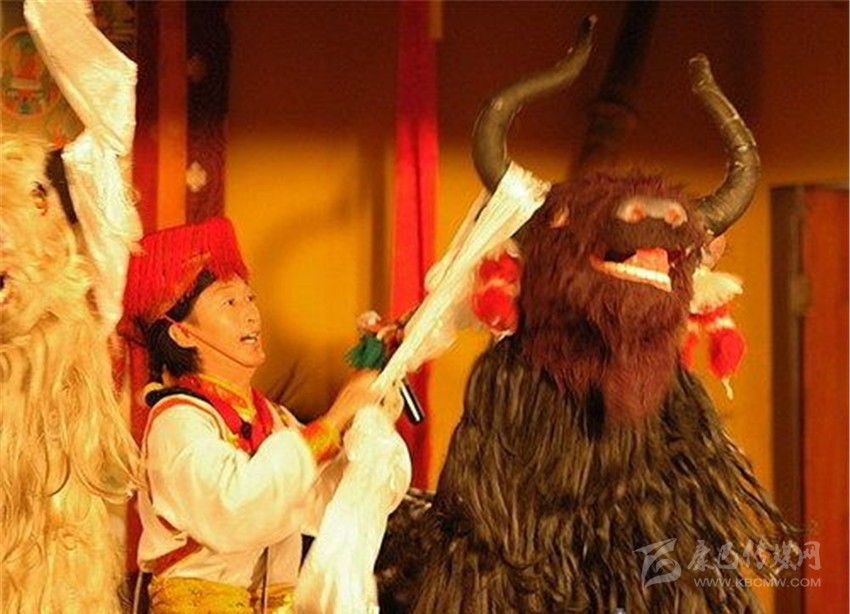 之后,由演員扮演的牦牛會上場,牦牛由兩個演員扮演。一黑一白兩頭牦牛。關于白牦牛和黑牦牛的象征意義,說法不一,有的說白牦牛象征前藏地區(qū),黑牦牛象征后藏地區(qū);有的說白牦牛象征溫順和善良,黑牦牛象征勇猛和彪捍。